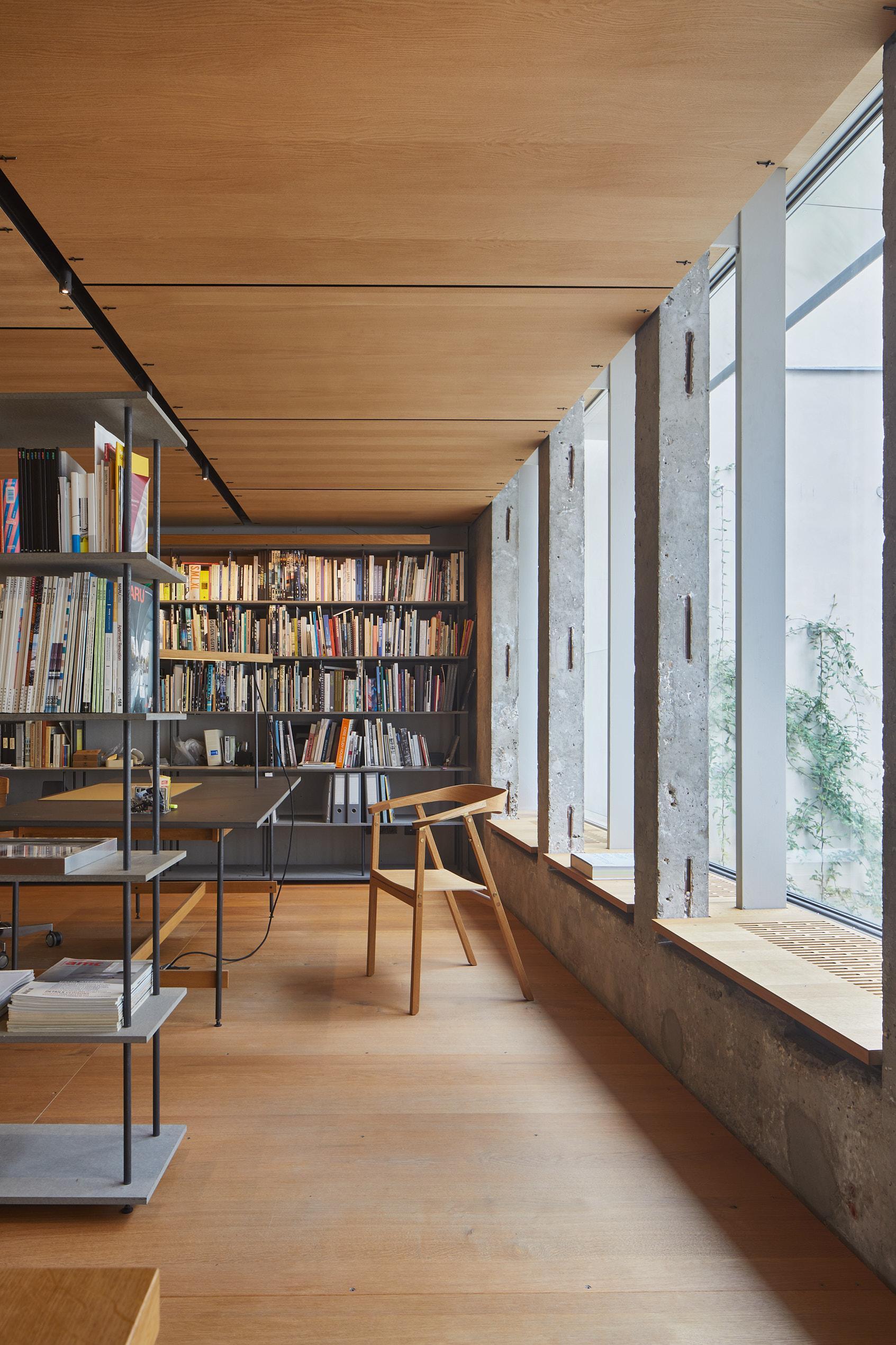 Wie bereits im Wohnbereich kommt auch hier unser Regalsystem „Superstructure“ aus der Hirnholz-Kollektion zum Einsatz. Es dient nicht nur als Stauraum, sondern auch als Besprechungstisch. In Kombination mit unserem Spindelhocker aus derselben Serie entsteht ein flexibler Bereich, der die notwendige Offenheit und Transparenz zum Dachgarten gestattet.