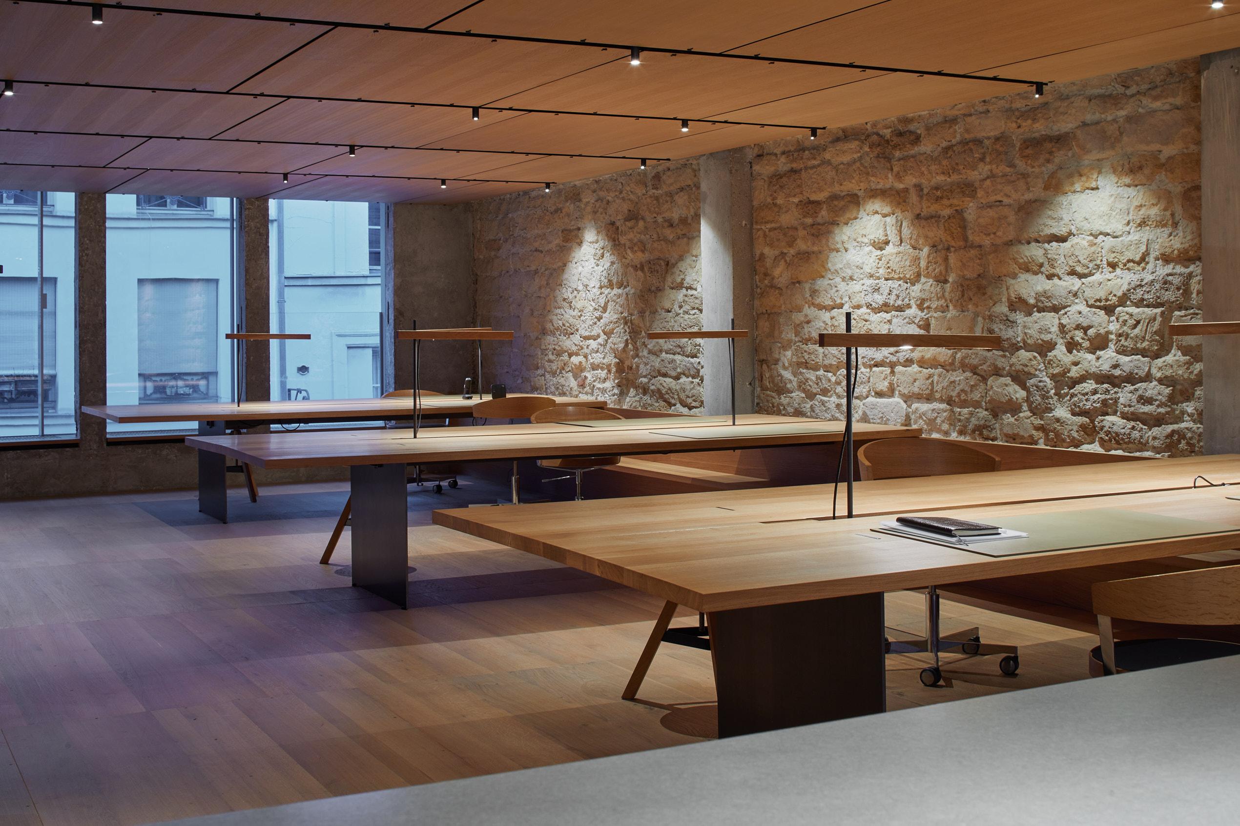 Die Arbeitstische bestehen aus drei großen Eichenholzplatten, die Platz für jeweils vier Mitarbeitende bieten. Eine Seite der Tischplatte steht auf Stahlblech mit Steckzapfen, die andere Seite liegt auf der Holzbrüstung auf. Strom-, EDV-Kabel und die Klimaanlage verlaufen unsichtbar hinter der Konstruktion.