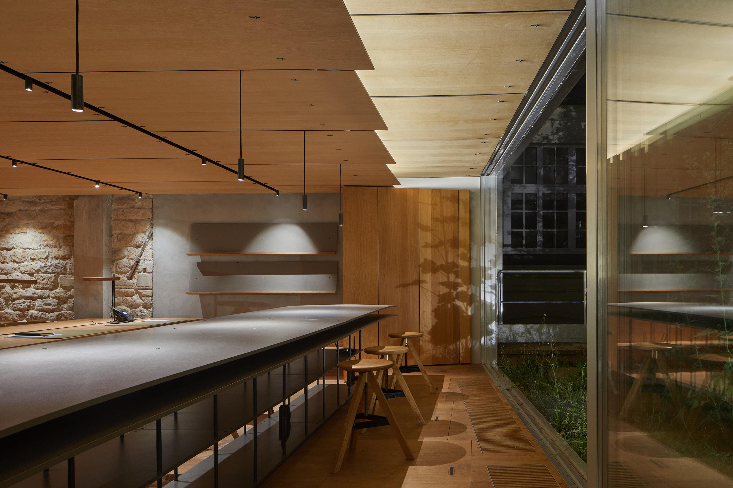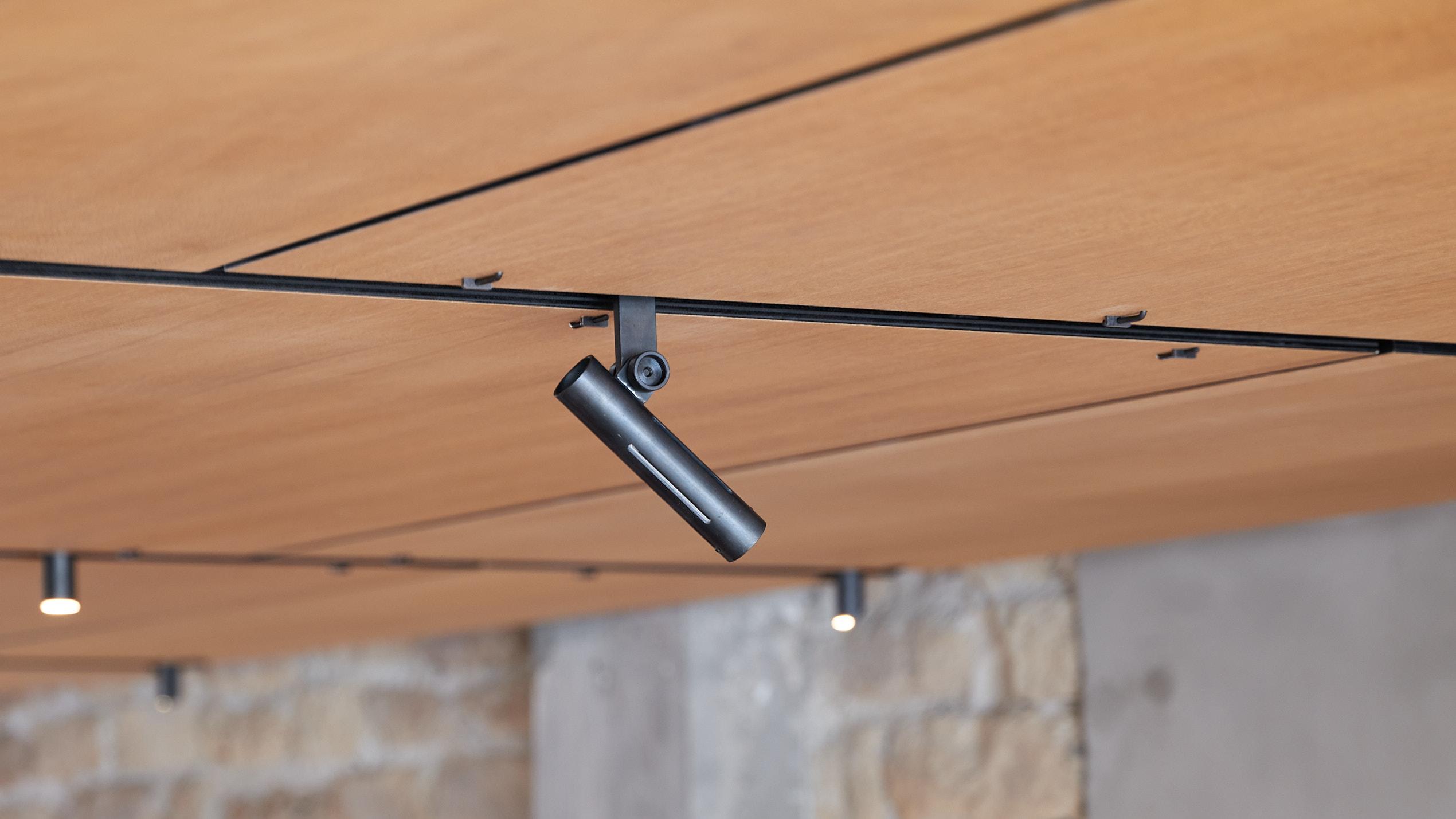 Die geringe Raumhöhe stellte besondere Anforderungen an die Gestaltung der Decke. Weil die Decke dem Menschen räumlich sehr nah kommt, wurde Holz als Material ausgewählt. Die quadratischen Eichenpaneele nehmen auch optisch die Struktur des Bodens auf. Die Paneele wurden auf ein Metallstecksystem montiert, das jederzeit Zugang zu den technischen Installationen wie Wasser, Heizung und Strom ermöglicht. Die Unterkonstruktion aus Schwarzstahl dient sowohl als Kabelkanal als auch als magnetischer Träger für die Leuchten. Alle sichtbaren Stahlteile wurden von uns entworfen und zusammen mit einem Schlosser gebaut. Die Lichttechnik stammt von Georg Bechter.